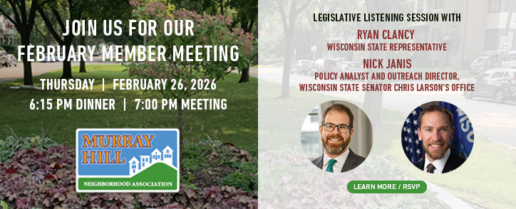 Day: Thursday, February 26, 2026Time: 6:15 p.m. Dinner; 7:00 p.m. MeetingPlace: Plymouth Church, 2717 E. Hampshire Street Join Us for Our 2026 MemberDinner and Meeting Kickoff February 26 at Plymouth Church! Wisconsin Legislative Listening Session Featuring: Ryan ClancyWisconsin State Representative Nick JanisPolicy Analyst and Outreach Director,Representing Wisconsin State Senator Chris Larson’s Office This is Your Opportunity to Discuss Important Issues and Topics with Your Wisconsin